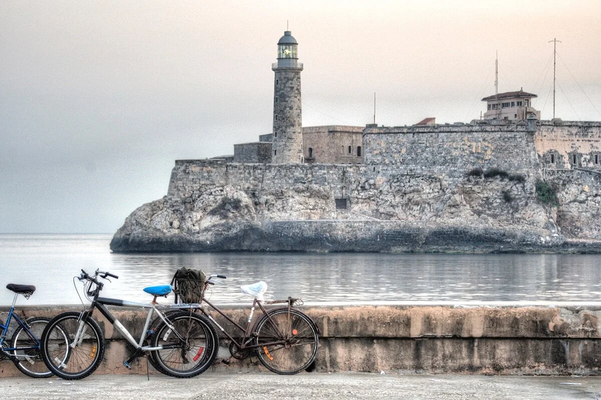 This photo at the harbor in Havana, Cuba has some com-positional elements that strengthen the overall image.The bikes in the foreground give some cultural context to how people travel where few have cars. Although the left bike is cut off, the focus is on the three seats of different colors.Remember that three is a really good number in composition. The tower in the background is slightly off center and the other building to the right helps balance the overall composition.
